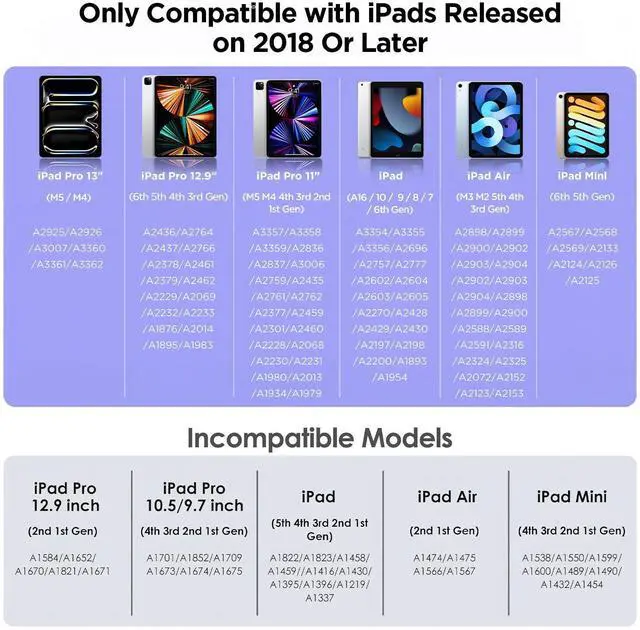 Compatible Devices iPad Air Series: iPad Air (2024, M2) ; iPad Air 5th - A2588/A2589/A2591; iPad Air 4th -A2316/A2324/A2325/A2072; iPad Air 3rd - A2152/A2123/A2153/A2154, iPad Pro Series: iPad Pro 11-inch (2024, M4); iPad Pro 13-inch (2024, M4); iPad Pro 11-inch (2018-2023) - A2759/A2435/A2761/A2762/ A2377/A2301/A2459/A2460 /A2228/A2068/A2230/A2231/A1980/A2013/A1934/A1979; iPad Pro 12.9-inch (2018-2023) - A2436/A2764/A2437/A2766/A2378/A2379/A2461/A2462/ A2229/A2069/A2232/A2233/A1983/A2014/A1895/A1876, iPad Series: iPad 10th (2022) - A2696/A2757/A2777; iPad 9th (2021) - A2602/A2603/A2604/A2605; iPad 8th (2020) - A2270/A2428/A2429/A2430; iPad 7th (2019) - A2197/A2200/A2198; iPad 6th (2018) - A1893/A1954;, iPad mini Series: iPad mini 6th -A2567/A2568/A2569; iPad mini 5th - A2133/A2124/A2126/A2125