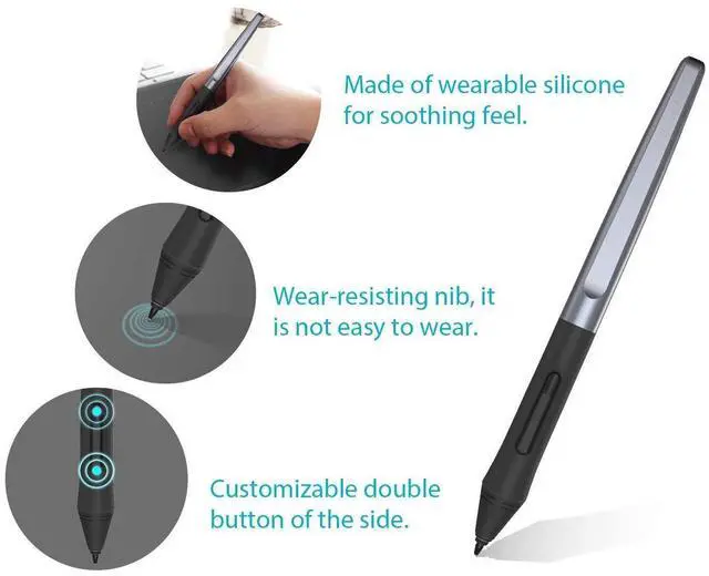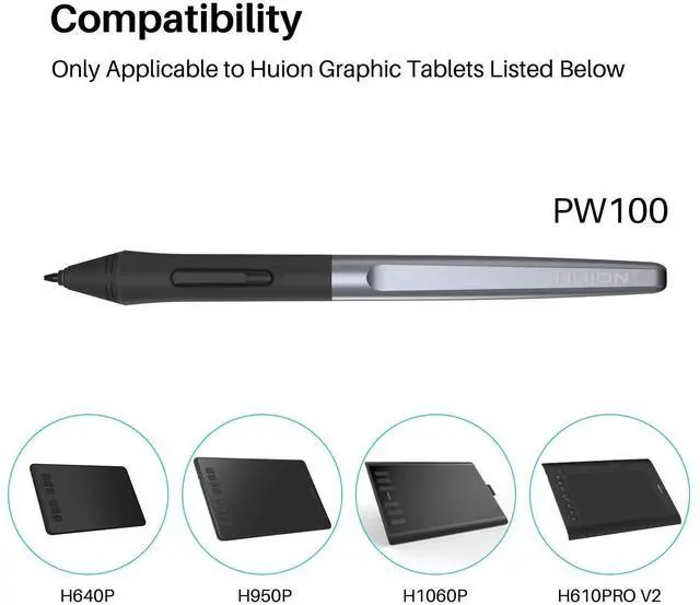 Battery-free Stylus - Only COMPATIBLE to Huion Inspiroy H640P/H950P/H1060P/H610Pro V2/HS610/HS64/H420X/H580X/H610X; Never worry about pen-charging, and eco-friendly of use; Without operating battery, the pen is only 16g in weight, and its front end is made of wearable silicone for soothing feel.