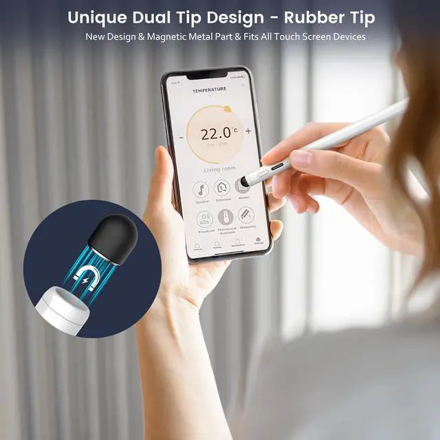 Latest Dual-Tip Stylus - Versatile Rubber TipThis pen for apple represents a novel breakthrough by combining a rubber tip with the active fine tip. It operates seamlessly on any capacitive touchscreen, from smartphones to tablets and smartwatches. When your stylus pen runs out of battery, it serves as the perfect backup. The tip includes a magnetically attachable metal component, making replacement easy and convenient. (Note: The rubber tip is compatible with touchscreens, while the fine tip is designed for iPads.)