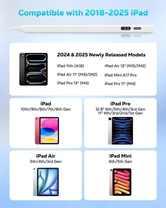 Yes, compatible with all iPad models released after 2018, such as iPad 11 (A16)/10/9/8/7/6, Air 13"/11" (M3)/(M2), Air 6/5/4/3, Mini A17 Pro/6/5, Pro 13"/11" (M4), Pro 12.9" 6/5/4/3, Pro 11" Series.