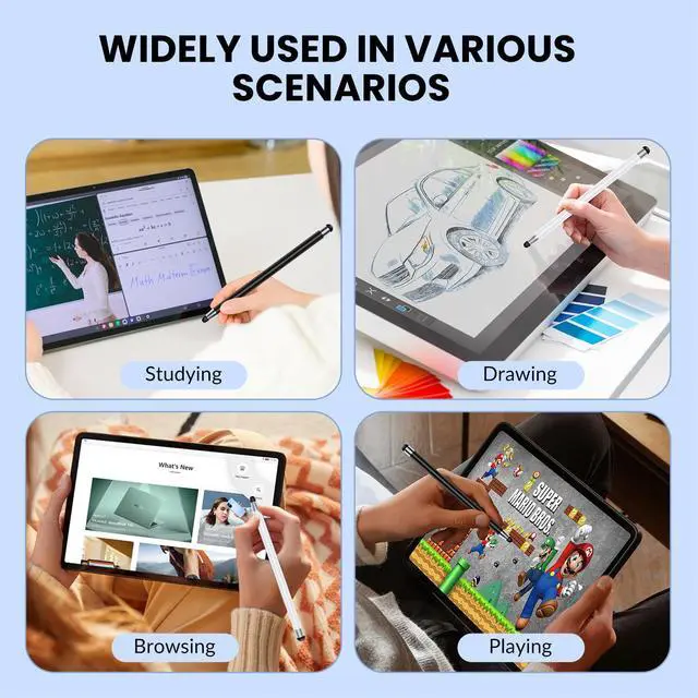 • Dual-Tip Flexibility Experience unparalleled accuracy with our dual-tip stylus, 2 different sizes rubber tips(0.21'' / 0.27'') designed for smooth, responsive performance across tasks like browsing, writing, drawing, and gaming.