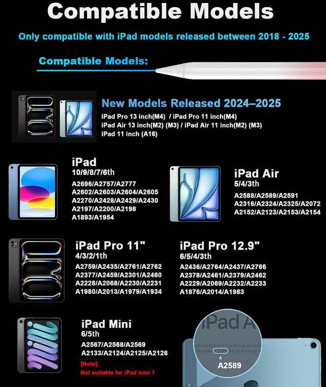 Compatible with iPad 2018-2025 This iPad Stylus is Only compatible with Apple iPad Air 11-inch & 13-inch (M2) (M3), iPad Pro 11-inch & 13-inch (M4), iPad 6/7/8/9/10/11(A16) Gen, iPad Pro 11-inch 1/2/3/4 Gen, iPad Pro 12.9-inch 3/4/5/6 Gen, iPad Air 3/4/5 Gen, iPad Mini 5/6 Gen.NoteThis stylus is NOT compatible with models prior to 2018 and does NOT work with iPhone, Android and Microsoft devices. Before purchasing, please make sure to check the model on the back of the iPad