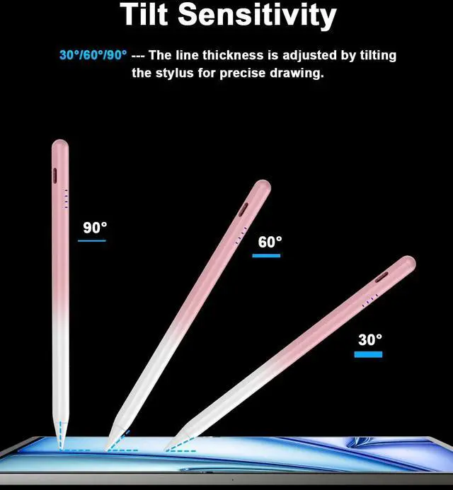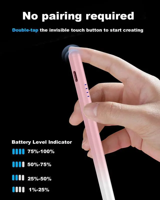 Battery Indicator / Type-C Charging This iPad Pen uses the popular Type-C charging port for charging, and can be used for 8 hours after 20 minutes of charging. When charging, four lights on the side of the stylus will light up gradually, each light represents 25% of the power, so you can observe the charging status and power usage in real time, and keep track of the remaining power at all times to ensure that you don't drop the ball during critical work time. The iPad stylus has a sleep function. When you forget to turn it off, keep it still for 5 minutes and the stylus will automatically turn off, effectively saving battery life