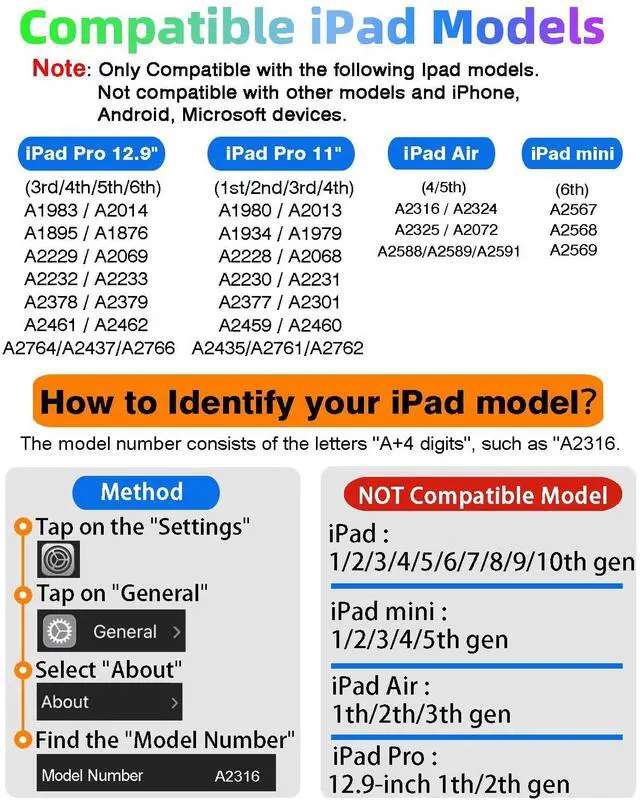 Compatible ModelsiPad pencil 2nd generation is suited for the Pad Air (4th/5th Gen), iPad Mini 6th Generation, iPad Pro 11"(1st/2nd/3rd/4th Gen), iPad Pro 12.9"(3rd/4th/5th/6th Gen)Note: Just work for the above model.Does not support any other iPhone, Android, or other devices. For specific models, please refer to the model diagram on the product introduction page. Before purchasing, please confirm whether your model is in the compatible model list.