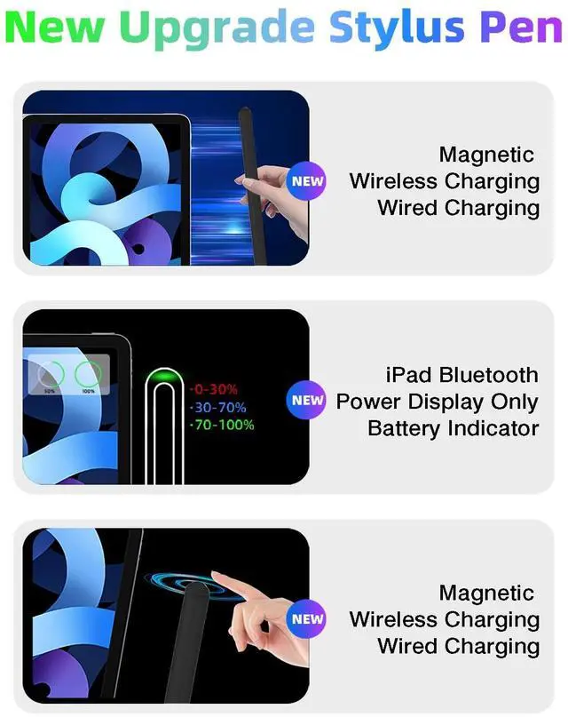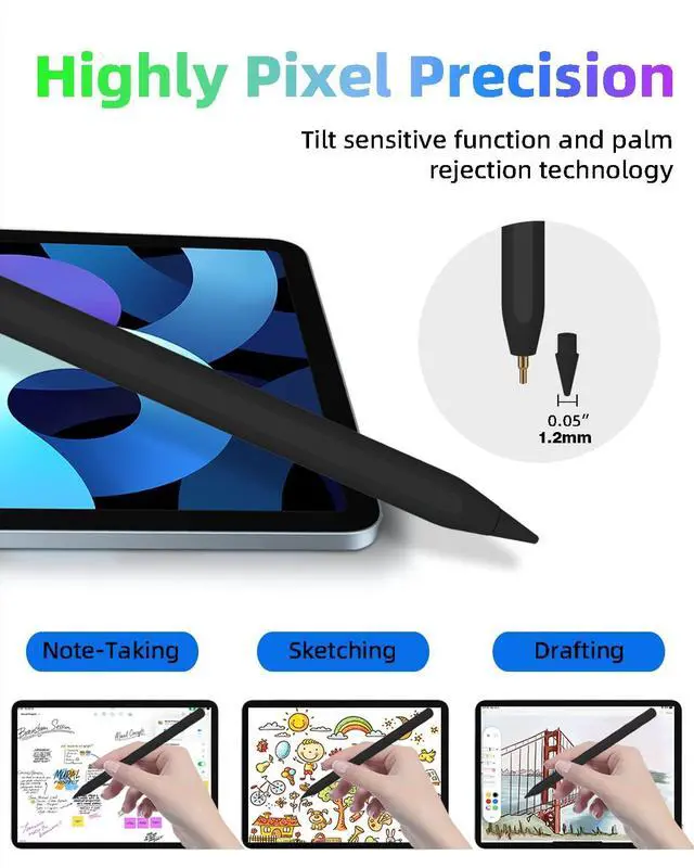 Bluetooth Magnetic ChargingThe stylus pen for iPad supports Bluetooth connection and has a magnetic wireless charging design. Just connect Bluetooth and magnetically attach it to the side of the iPad to charge.Please confirm whether your iPad model is compatible before purchasing. Incompatible models will not be able to charge. Add the widget to check the power in real time. Charge it anytime and anywhere. It only takes 1.5 hours to charge fully and can last up to 9 hours operations within 20 minutes will enter sleep mode.