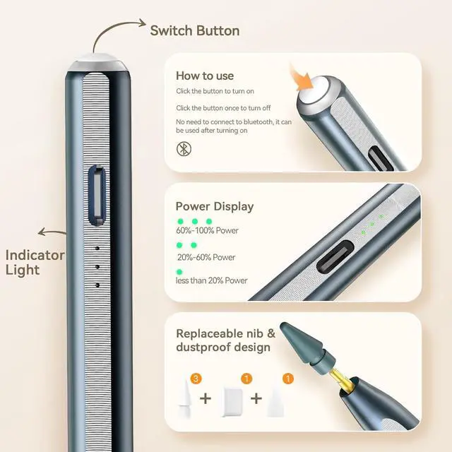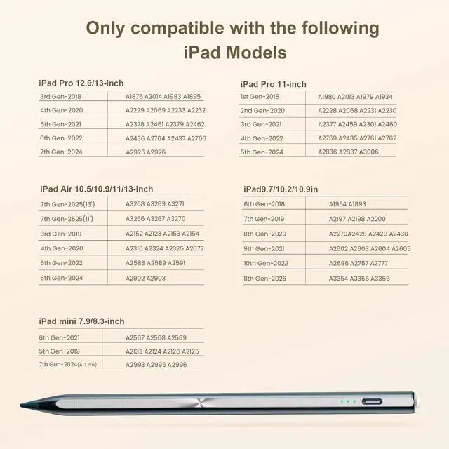 • Wide Compatibility: Stylus pen supports iPad 2018-2026 series:iPad 11th 11 inch 2025/10/9/8/7/6th GeniPad Air 11 inch (M4) 2026/13 inch (M4) 2026/7/6/5/4/3th GeniPad Pro 13 inch M4iPad Pro 12.9 inch 3/4/5/6th GeniPad Pro 11 inch 1/2/3/4th/M4iPad Mini 7th (A17 Pro)/6/5th Gen.NOTE: The Pencil is NOT compatible with iPad models before 2018, iPhone, Android and Microsoft devices. Please check your product model before placing an order.
