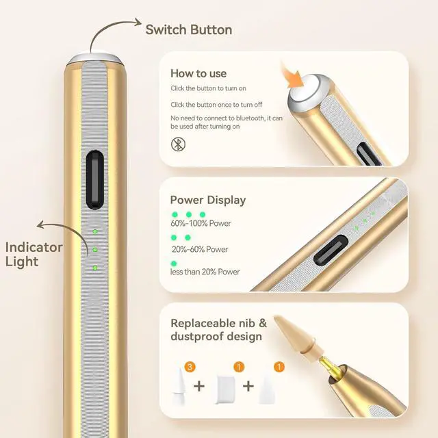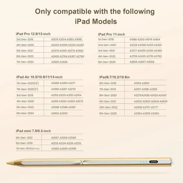 Experience precise and responsive input with the Stylus Pen for iPad, designed for compatibility with iPad models from 2018 to 2026, including iPad 11th, 10th, 9th, 8th, and 7th Gen, as well as iPad Air, Pro, and Mini series. This stylus pen features ultra-fast charging via a Type-C interface, achieving a full charge in just 13 minutes and providing over 10 hours of continuous useideal for extended creative or productivity sessions.