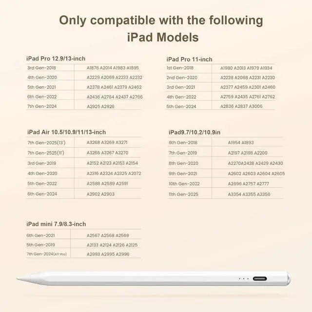 Experience precise and responsive input with the Stylus Pen for iPad, designed for compatibility with iPad models from 2018 to 2026, including iPad 11th, 10th, 9th, 8th, and 7th Gen, as well as iPad Air, Pro, and Mini series. This stylus pen features ultra-fast charging via a Type-C interface, achieving a full charge in just 13 minutes and providing over 10 hours of continuous useideal for extended creative or productivity sessions.