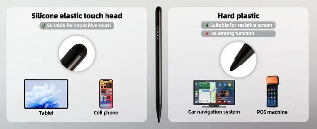Experience universal compatibility with our dual-tip stylus, featuring both silicone round head and plastic tip options.Designed for seamless use across and all major devices,this stylus works with both capacitive and resistive screens,our 2-in-1 functionality has you covered.