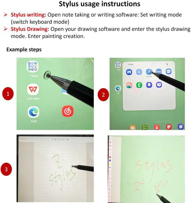 fllynewrite brand stylus, suitable for touch screen devices (Samsung Galaxy Tab A11/A11+/A9+ Plus/A9/A8/A8 Plus/A7/A7 Lite, for Apple iPad Pro/iPhone/Fire HD//Surface/HP, etc., and also compatible with major operating systems, such as: Google, Android, Microsoft, etc.), you can use it like a real You can use our stylus to write on drawing applications, take notes, read news, play games, etc., just like any other touch screen device. Stylus writing: Open note taking or writing software: Set writing mode (switch keyboard mode) Stylus Drawing: Open your drawing software and enter the stylus drawing mode. Enter painting creation.