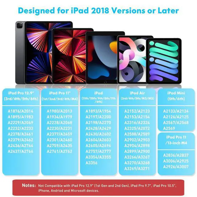 Compatible with iPad 2018 and later versions. Only supports for iPad Pro 11/13-Inch M4,iPad Air 11/13-Inch M2/M3,iPad 11th (A16),iPad 10th/9th/8th/7th/6th gen, iPad Pro 12.9" (3rd/4th/5th/6th gen), iPad Pro 11", iPad Air 3rd/4th/5th gen, iPad mini 5th/6th/A17 Pro.