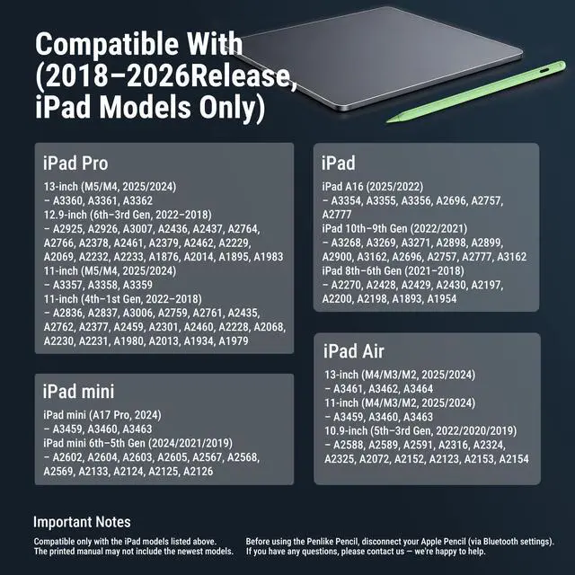 Designed for iPad 2018-2026 Models: Specically engineered for Apple iPad versions released after 2018. Perfectly compatible with iPad 10th/9th/8th/7th/6th Gen, iPad Air 3rd/4th/5th and new M2/M3 Air 11/13, iPad Pro 11/12.9 and M4 Pro 13, iPad Mini 5th/6th/A17 Pro. Note: Not compatible with iPhone, Android, Microsoft devices, or iPad versions before 2018. Please check your model number before ordering, FOR OTHER MODELS, PLEASE SEARCH ASIN B0GC5MSCDC