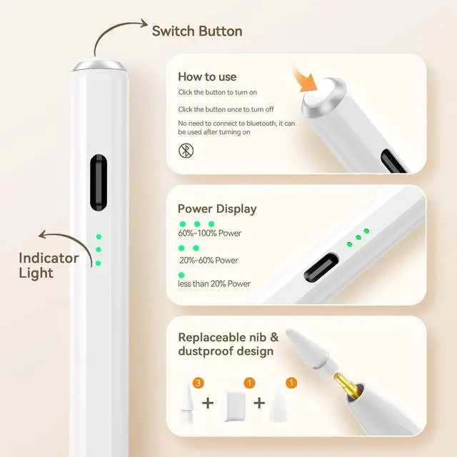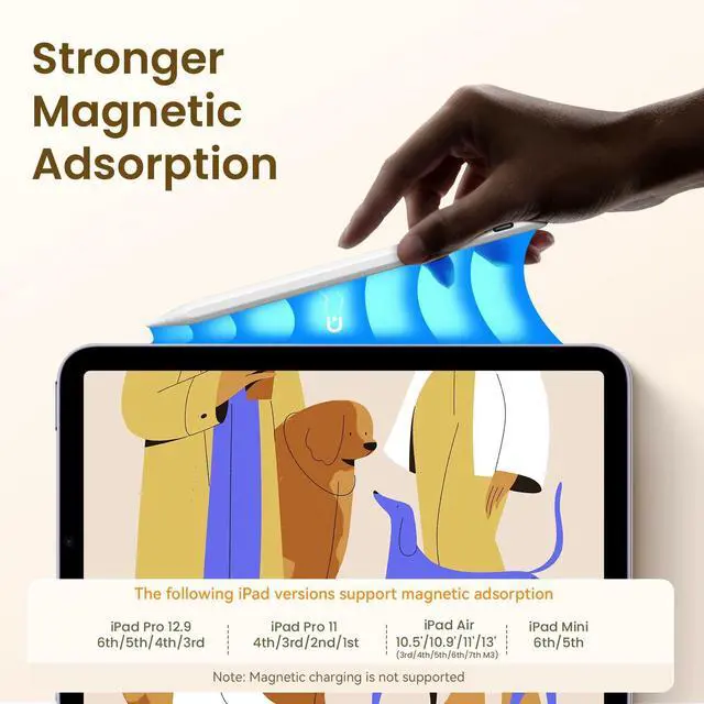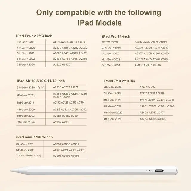 Wide Compatibility: Stylus pen supports iPad 2018-2026 series:iPad 11th 11 inch 2025/10/9/8/7/6th GeniPad Air 11 inch (M4) 2026/13 inch (M4) 2026/7/6/5/4/3th GeniPad Pro 13 inch M4iPad Pro 12.9 inch 3/4/5/6th GeniPad Pro 11 inch 1/2/3/4th/M4iPad Mini 7th (A17 Pro)/6/5th Gen.NOTE: The Pencil is NOT compatible with iPad models before 2018, iPhone, Android and Microsoft devices. Please check your product model before placing an order.