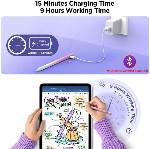• 15 Mins Fast Charging, 9 Hours of Use No need to charge frequently. Experience uninterrupted creativity with our iPad pencil lightning-fast charging capabilities. 2X Faster Charging speed than others. Just 15 minutes of charging provides an impressive 9 hours of continuous usage, long lasting battery life.This ensures that your creative process is not interrupted. You can use it all day long.