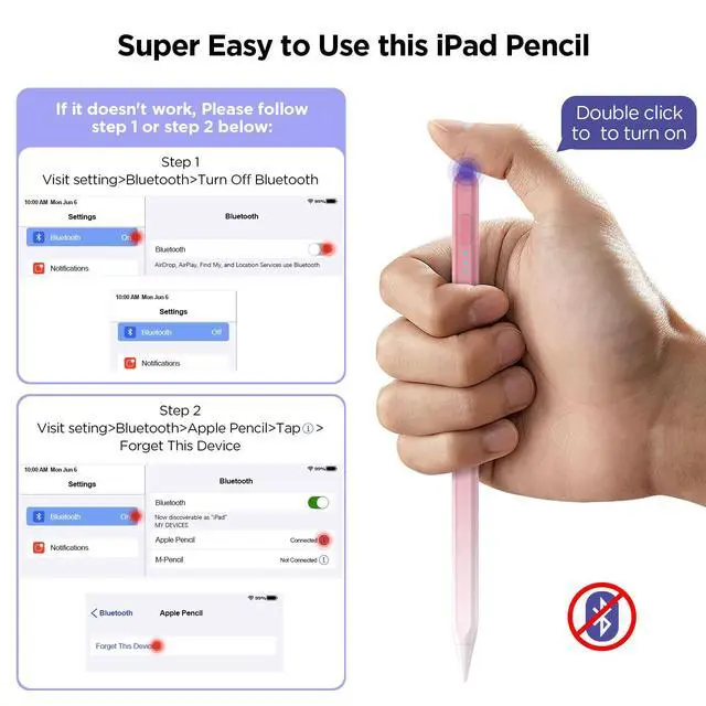 • For iPad 2018-2025No need to connect to Bluetooth.This ipad pencil is compatible with Apple iPad 2018-2025. This Pencil for iPad 11th/ 10th/ 9th/ 8th/ 7th/ 6th; iPad Pro M5/ M4/ 12.9 inch/ 11 inch; iPad Mini 5th/ 6th/ 7th; iPad Air (5th /4th /3rd); New iPad Pro 2024 11 inch &13 inch (M4, M5); New iPad Air 2024 11 inch &13 inch (M2, M3). Not compatible with iPad Pro 12.9 inch(2th/ 1st), iPad Pro 10.5/9.7 inch(4th/ 3rd/ 2nd/ 1st), iPad 5th/ 4th / 3rd/ 2nd / 1st, iPad air 2nd/ 1st, iPad Mini 4th /3rd/ 2nd/ 1st.And it's easy to use! Double-click the top touch control to turn it on.This iPad pen is magnetically adsorbed and can be attached to the iPad when not in use.