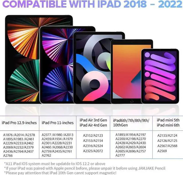 The stylus supports for iPad series 2018-2022 model: iPad 10th/9th/8th/7th/6th Gen, iPad Air 3rd/4th/5th Gen, iPad Pro 11 inches,iPad Pro12.9 inches 3rd/4th/5th/6th Gen,iPad Mini 5th/6th Gen.
