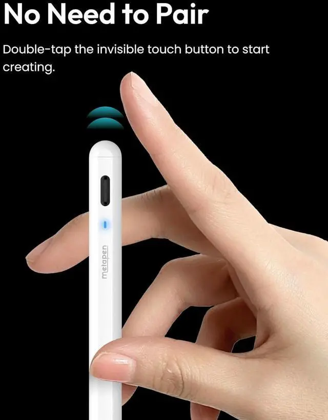 Double Magnets: No need to connect via Bluetooth or apps. Simply double-tap the invisible touch switch on the rounded end of A8 to power ON/OFF. With two built-in magnets the Metapen iPad Pen securely attaches to your iPad anytime no more rolling away or getting lost.