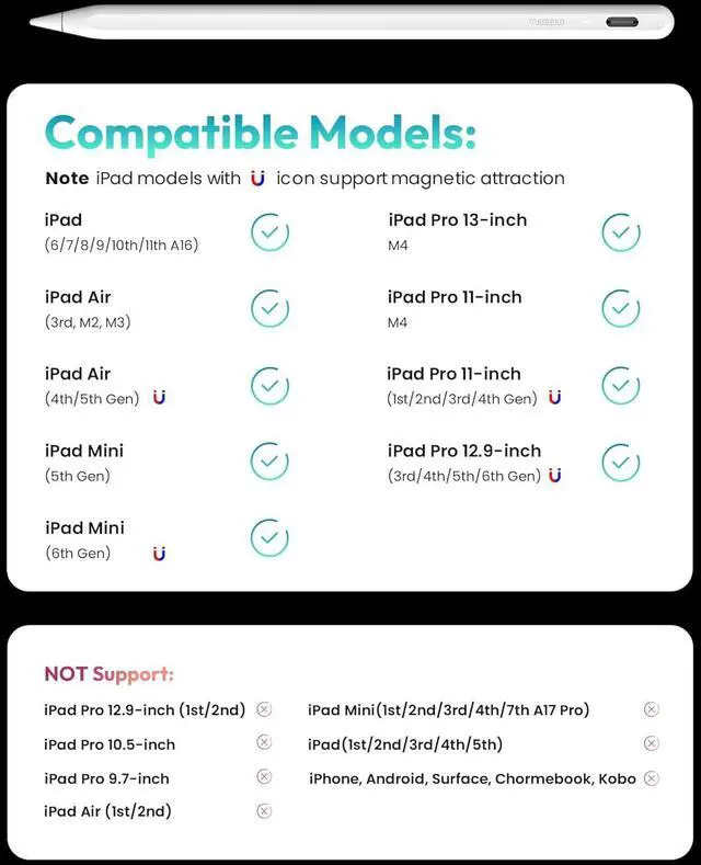 Model is Compatible: Metapen Pencil A8 is ONLY compatible with the iPad models 2018-2025: iPad 11/10/9/8/7/6 Gen iPad Pro 13-inch M4 iPad Pro 11-inch 1/2/3/4/M4 iPad Air 3/4/5/M2/M3 iPad Pro 12.9 -inch 3/4/5/6 Gen iPad Mini 5/6 Gen.