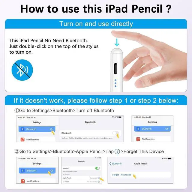 Easy to UseDouble tap the top of the ipad stylus to turn ON/OFF easily without connecting Bluetooth. If you find it doesn't work after turning on please turn off