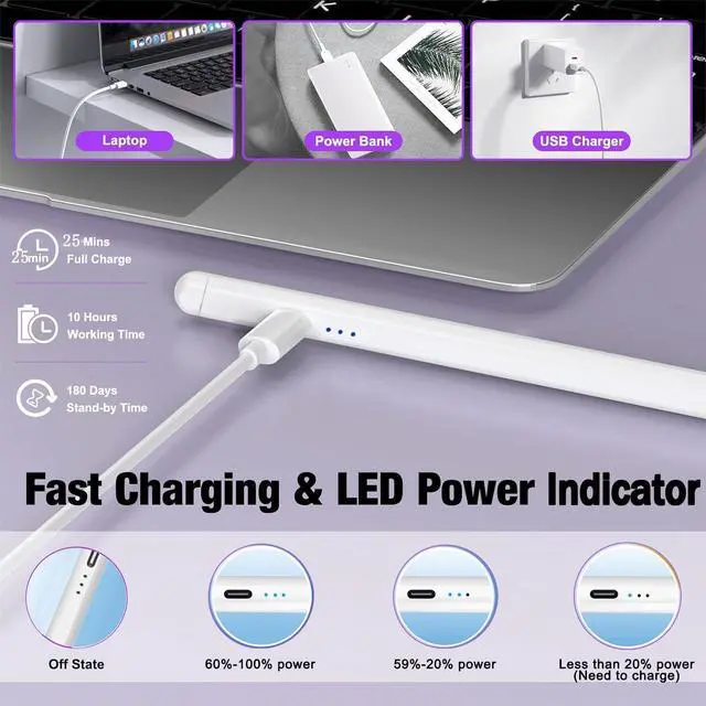 Note: Stylus for iPad doesn't support pressure sensitivity. 25 Mins Fast Charging & Power Display pencil charges fully in 25 minutes and allows 10 hours of continuous use. It also auto shuts down after 5 minutes of inactivity to save power. Triple-IndicatorThis pencil for iPad is equipped with a built-in indicator light with just a glance effortlessly gauges your pencil's battery life ensuring you're always ready to create.