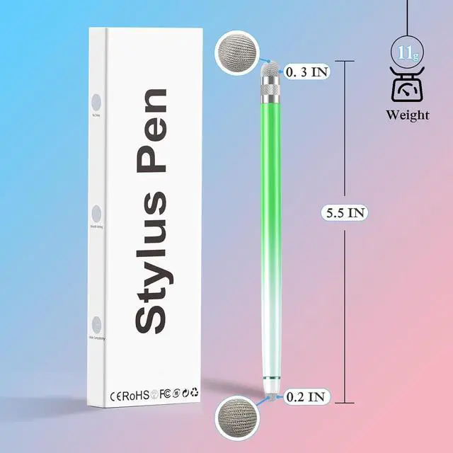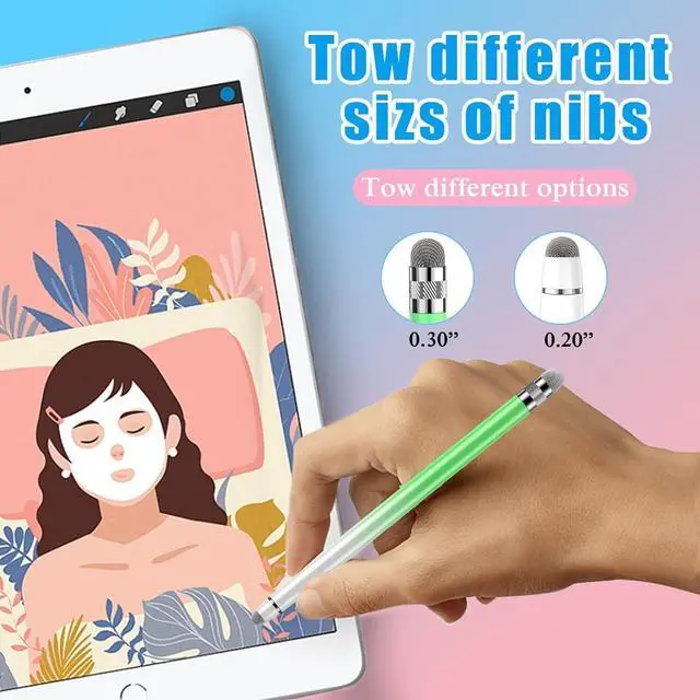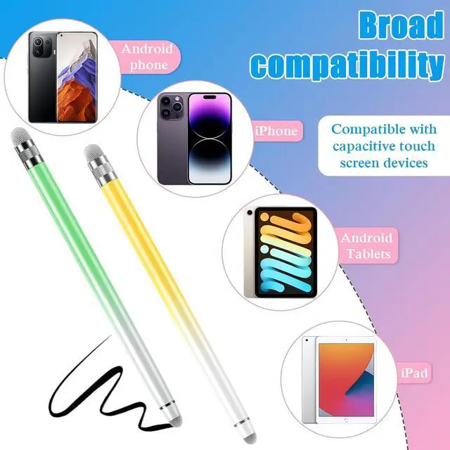 Stylus Pens for Touch ScreensStylus pen is no delay and no lag during use and ipad stylus will not damage your screen stylus pen for ipad has 2 different sizes of nibs so you can have more options for a more accurate writing and drawing experience. Universal Stylus for iPadCompatible with capacitive touch screen devices including iPad iPad Pro iPhone Android tablets smart phones galaxy etc. Fiber TipAndroid stylus pen with tip made of soft fiber reacts smoothly on touch screen perfect for writing and drawing effectively protects your touch screen from scratches. No Extra OperationsThis iPad pen is very easy to use you don't need to download an app or other operations to use the iPad stylus you can just pick up the stylus and start writing drawing and playing games it's that simple.