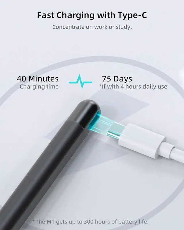 Fast Charge & Longer Standby No PanicEnjoy Metapens leading Type-C fast charging and extended battery life. The Stylus M1 takes only 40 minutes to fully charge providing up to 300 hours of standby time. A quick 5-minute charge delivers up to 80 hours of use outperforming most brands on. Perfect for students business professionals and creators who take notes and draw frequentlyFluent Writing & Eraser Side ButtonExperience fine control with 1024 pressure levels. Digital ink flows smoothly from the 1.0 mm tip in real time with no lag or latency. Quickly erase mistakes with the dedicated eraser button conveniently placed where your thumb naturally restsAdvanced Cone-Shaped Tip & Premium FeelUnlike old-fashioned styluses with tubular tips the Metapen M1 features a cone-shaped tip for stronger signal detection and a streamlined design.