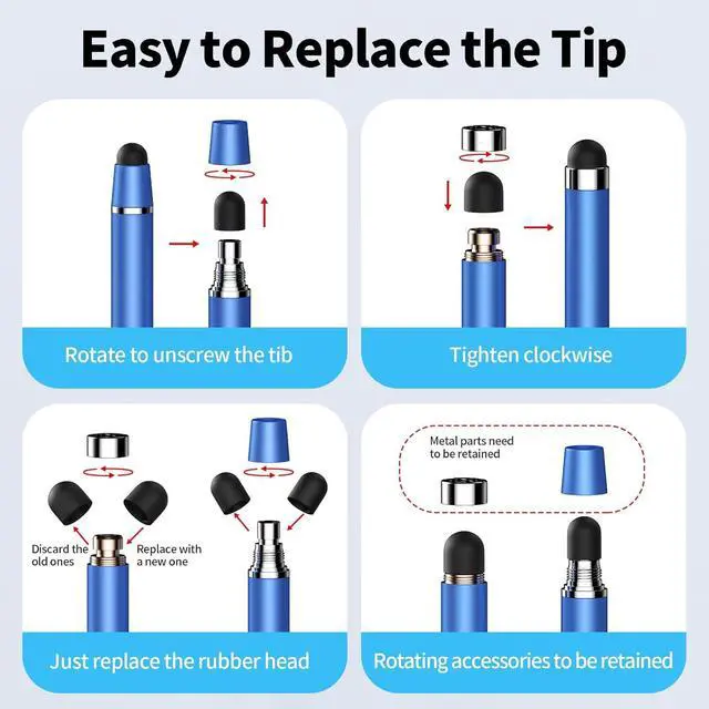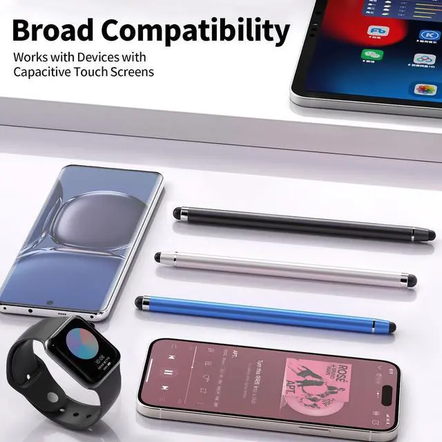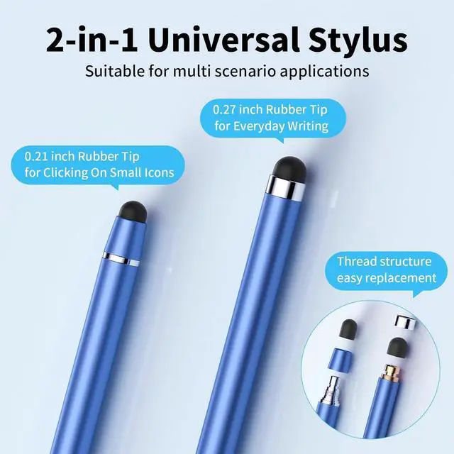 2 in 1 stylusstylus pen for touchscreen is available in two different design sizes ( 0.27 inches/ 0.21 inches) different usage scenarios Combining functionality and elegance stylus pen bring you a more accurate writing/drawing/touching experience and enhance your creative pleasureSoft rubber tip stylus penstylus pen for touchscreen is made of lightweight alloy and vibrant colours the pen is lightweight and comfortable to hold the soft rubber design on both ends effectively your screen device from scratches fingerprints smudges and scratches there is no need for bluetooth connectivity or charging just pick up the stylus and start writing drawing easilyHigh accuracy and sensitivitystylus pens for touch screens is equipped with a dual-ended soft rubber tip with high accuracy and sensitivity which allows you to glide smoothly across the screen with ease enabling you to write swipe tap and draw seamlessly without delays and disconnections stylus pen for ipad gives you better accuracy and sensitivityWide compatibilitystylus pens are compatible with a wide range of touchscreen devices for Android iPad iPhone mobile phones tablets Surface Galaxy Chromebooks etc.