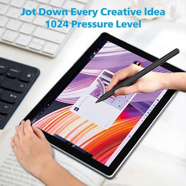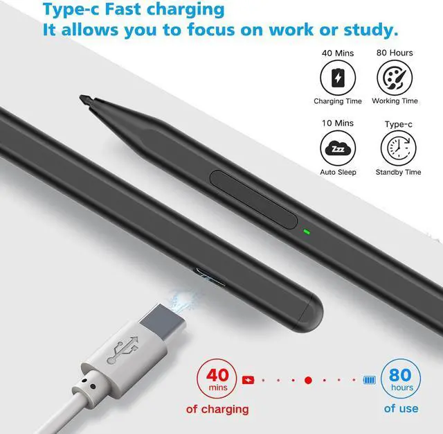 Easy to Replace Tip: 2 extra nibs for easy replacement at any time. Fast Charge &Smart StandbyEnjoying Milikilo's pen for surface leading Type-C fast charge and longer battery life Stylus F97 only takes 40 minutes to fully charge for 80 hours of battery life. Automatically turn in Sleep Mode if idle for 10 minutes to save power. Perfect for students business professionals and creators who take notes and draw frequently. Palm Rejection&Double MagnetsWith palm rejection technology you can rest your hand naturally on the screen without fatigue or accidental touches. The F97 pen for surface attaches firmly to your Surface tablets with two stronger built-in magnets Milikilo Surface pen is always there and ready to jot down when inspiration strikes. Tilt Function&Premium FeelThe F97 pen for surface has a tilt and thickness feature that enables the line to become thicker as the pen is tilted at a larger angle. This is especially useful for creating precise outlines and shading making it ideal for drawing purposes. Fine control with 1024 pressure points. Milikilo Surface Pen has a CNC and gold-plated nib that provides a smooth crisp line.
