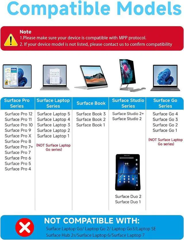 NOTE: Does NOT work with Surface Laptop Go Series which belongs to a different series than Surface Laptop and Surface Go. The F97 supports up to the MPP 1.15 protocol and works with most Surface devices. [Surface Model List]? Surface Pro 4/Pro (5th Gen) /Pro 6/Pro 7/Pro 7+/Pro 8/Pro 9/Pro X/Pro 10/Pro 11/Pro 12? Surface Book/Bk 2/Bk 3? Surface Laptop/Laptop 2/Laptop 3/Laptop 4/Laptop 5? Surface Go/Go 2/Go 3/Go 4? Surface Studio2/Studio2+;?