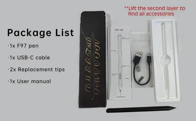 Package Included: 1xF97 Surface Pen 1xUSB-C cable 2xReplacement tips 1xUser manual. Eraser/Right-click Functions&Replaceable pen tipsThe Surface Pen comes with eraser and right-click functions the lower key is the eraser and the upper key is the right mouse button. which helps you to improve your work efficiency.