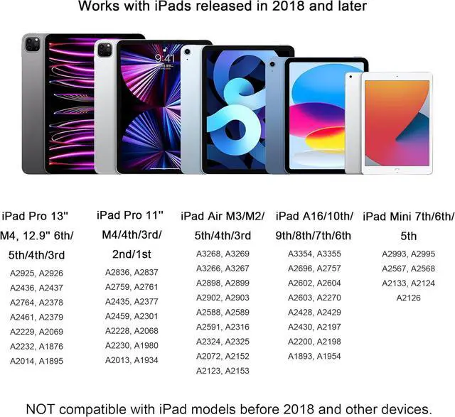Compatibility: This ipencil works with iPads released in 2018 and later iPad A16 11th/10th/9th/8th/7th/6th Generation iPad Pro 13 inch M4 iPad Pro 12.9 -inch 6th/5th/4th/3rd Gen iPad Pro 11 M4/4th/3rd/2nd/1st Gen iPad Air M3/M2/5th/4th/3rd Gen iPad Mini A17 Pro 7th/6th/5th Gen. As a replacement for Pencil 1st/ 2nd gen & Pencil Pro. Before purchasing please check your iPad model in Settings> General> About> Model Name. NOT compatible with iPad models before 2018 and other devicesTilt