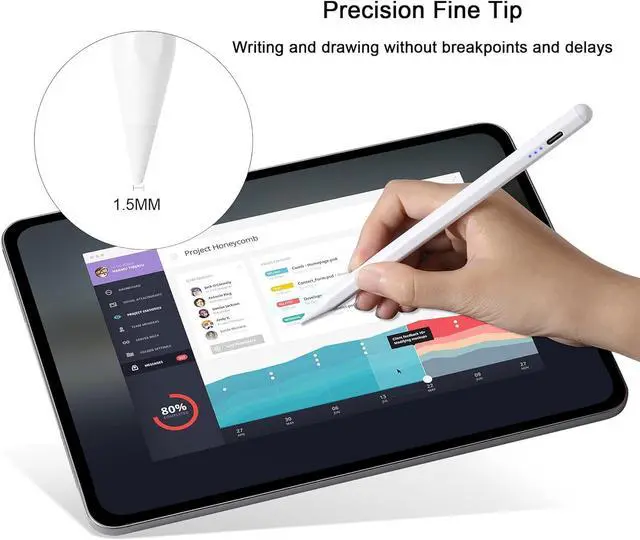 Fine Tip: Equipped with a 1.5 mm fine pen tip you can write and draw smoothly and accurately on your iPad easily writing small characters and drawing fine lines without breakpoints and delays just like a real pencil. Easy to install and remove pen tip. Comes with three extra replaceable tipsFast Charge &