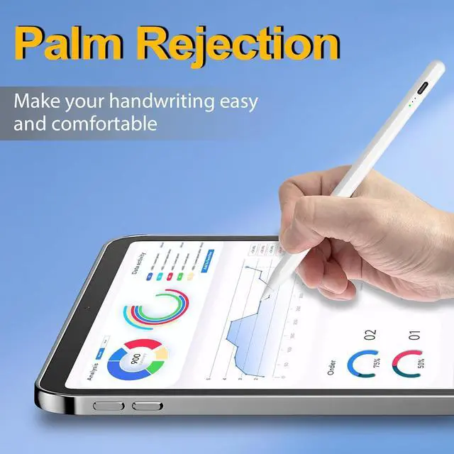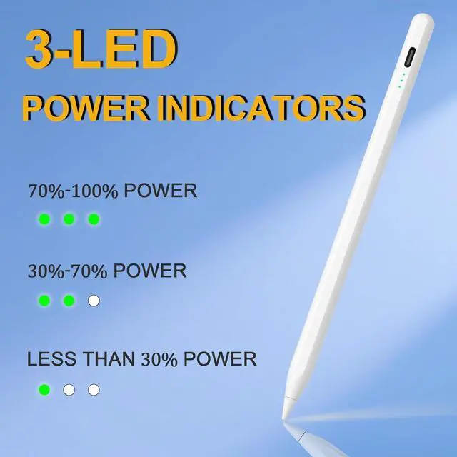Fast Charging: The stylus fully charges in just 15 minutes via a USB-C cable offering extended battery life for long-term use. Three LED indicators display the battery level ensuring timely recharging. It automatically powers off after 5 minutes of inactivity to conserve energy. Palm Rejection &