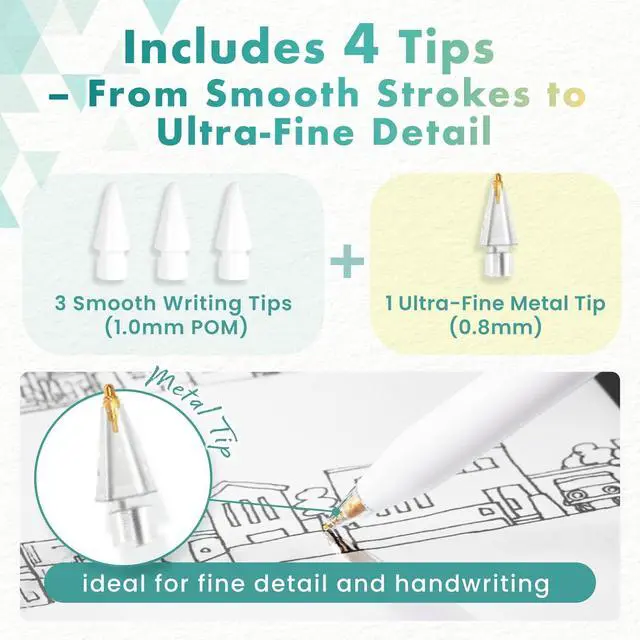 Fully recharges in 80 minutes. Auto sleep mode saves power when idle so its always ready to go.? Instant Response & Secure Magnet2025 upgraded shaft delivers 2× faster signal with no lag. 3-magnet design grips iPad firmly. Includes USB-C cable & 4 tips (3 POM + 1 ultra-fine metal).