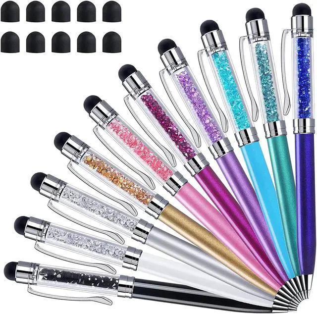 100% Compatible with all capacitive touch screen devices. High quality Ultra-sensitive 2 in 1 stylus and ball pen Smooth use on any screens of digital products responsive as finger touch. 10 Different colors crystals separately filled in upper half chamber of styluses tipped with durable soft rubber resistant screens from scratches fingerprints and grease. Ball pen ( black ink ) writes smoothly with a clip designed clip on the pocket case book ect. Perfect as small gift for your relative family friends.