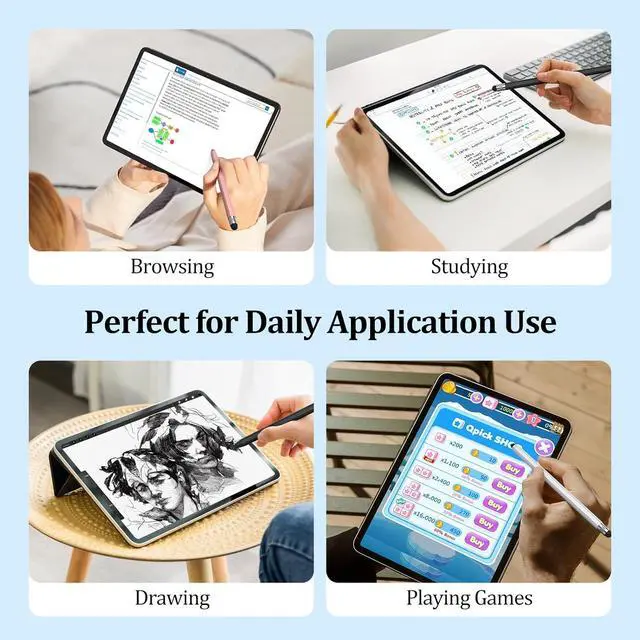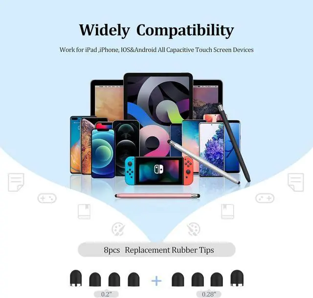 Magnetic Stylus Pen for iPadOur iPad pencil was designed with a magnetic attachment feature this stylus attaches effortlessly to compatible iPads some models 2018-2024. Keep your stylus secure and within reach whether you're using an iPad M4 10th gen Mini 6th gen Air 5th/4th gen or Pro models. With this iPad pen enhances portability and prevents misplacement! Easy Replaceable Tips Our tablet pens feature replaceable rubber tips on both ends. With a magnetic design at the top and bottom replacements are effortless and swift. Each stylus comes with 8 additional rubber tips effectively extending lifetime of your iPad pencil.