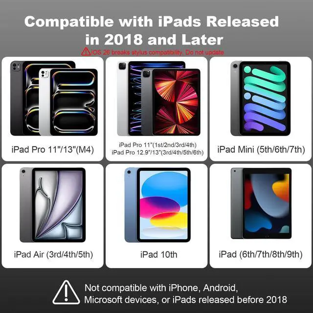 Models: Compatible with iPad Pro 11-inch (1st4th M4) iPad Pro 12.9 & 13-inch (3rd6th M4) iPad Air (3rd5th) iPad (6th10th) and iPad Mini (5th7th).?? Not compatible with iPhone Android devices or iPads released before 2018?? To ensure your stylus continues to work properly do not upgrade to iOS