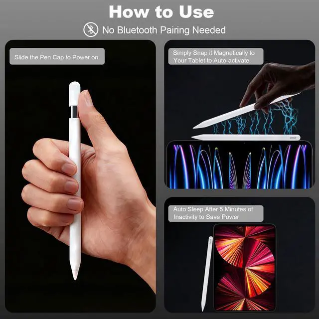 Power Control: Slide the pen cap to power on or simply snap it magnetically to your tablet to auto-activate. No Bluetooth pairing needed. Auto sleep after 5 minutes of inactivity to save power??