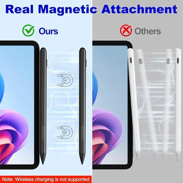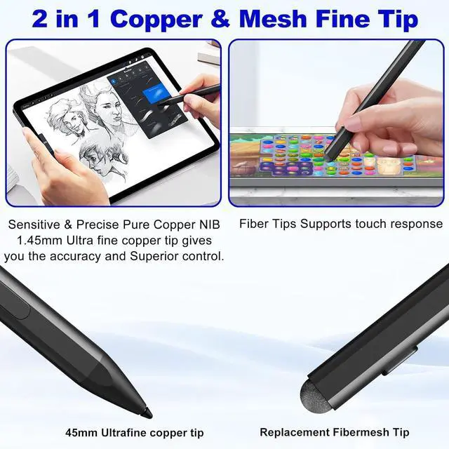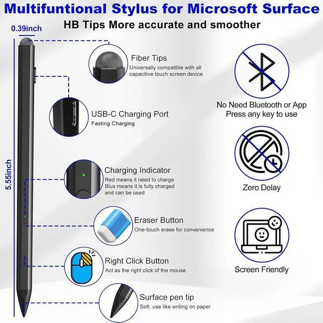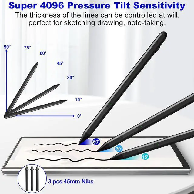 Equipped with two multi-functional buttons: eraser button (long-press to erase errors) right-click (one-click function also equivalent to the right mouse button). In addition the windows surface stylus is equipped with two powerful magnets that can be attached to the tablet portable and not easy to lose. Write or Draw Like on Paper - Surface Go 2 Pen features 4096 levels of pressure sensitivity the pen can recognize the pressure and tilt angle of the pen and draw lines of different thicknesses (the greater the pressure the thicker the line). In addition the 45mm pen tip simulates the feeling of real pen strokes allowing you to accurately outline shade and color on the screen. Smooth and natural no delay no lag! Anti Palm Touch Technology - Stylus for Surface Pro have anti palm touch technology. When drawing or handwriting your hand can be naturally supported on the tablet screen without worrying about unintentional touching of the screen by your hand resulting in interruption of text or drawing input. It's as easy and natural as drawing and writing on paper! Very free flowing. Dual-Touch Design - The surface pro 11 pencil has a two-in-one touch design. One end of the surface pro pencil tip uses traditional handwriting input to simulate the feeling of real pen strokes allowing users to write and draw more freely while the other end of the surface pen uses capacitive touch technology which can achieve operations similar to sliding and clicking on the smartphone screen.