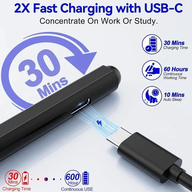 USB-C 30-Minute Fast Charging - The pen for surface pro uses a usb-c fast charging design which can be used for up to 60 hours after charging for 30 minutes. In addition the surface pro pen can automatically sleep after 10 minutes of inactivity. This greatly reduces battery consumption and extends the life of the Surface stylus.