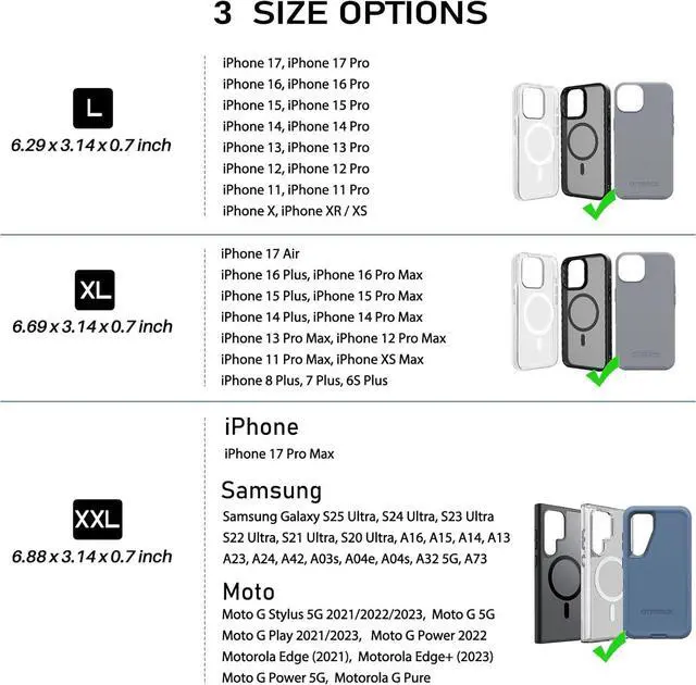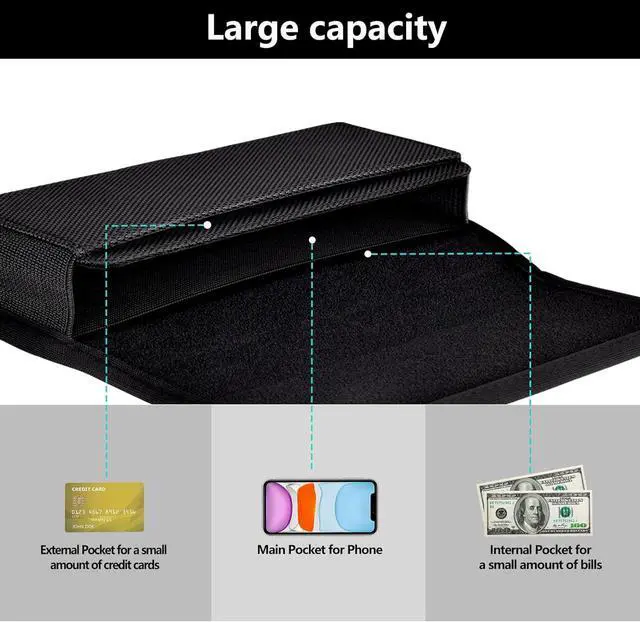Choose from three sizes: L - 6.29 x 3.14 x 0.7 inches XL - 6.69 x 3.14 x 0.7 inches and XXL - 6.88 x 3.14 x 0.7 inches for a perfect fit with your phoneProtection: Enjoy peace of mind knowing your phone is well-protected with durable nylon material and a soft inner lining that prevents scratches and other damagesConvenience: Featuring a belt clip and two belt loops you can use both together for maximum security while on-the-goVersatility: This phone belt holder includes a built-in money pocket and one card holder which can hold up to 2 bills and two cards making it an ideal choice for people who want to keep their essentials togetherSecurity: Magnetic closure keeps your phone secure and easily accessible giving you peace of mind knowing your phone is always safe and within reach