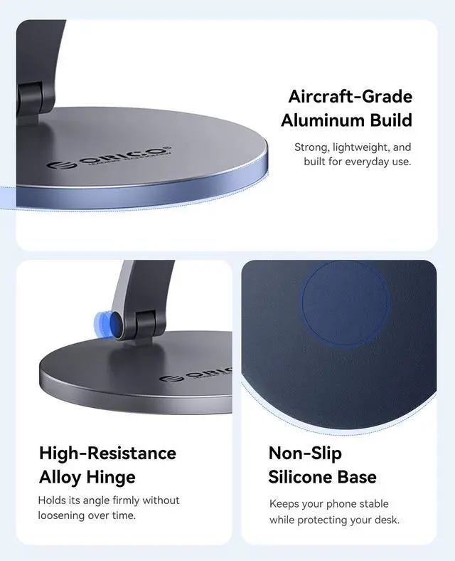 Rock-Solid Desk Stability: This aluminum desk phone stand features a reinforced frame and weighted base, supporting smartphones up to 1.7 lb (800g) and 6.9 inches.