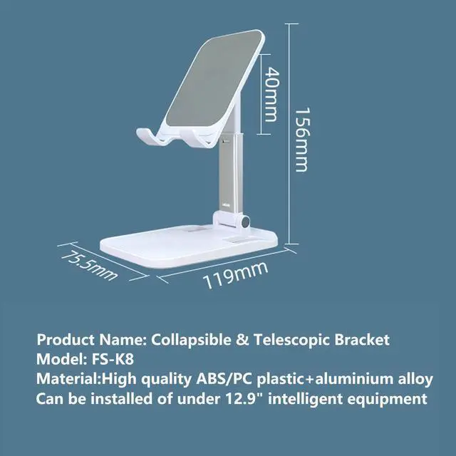 Material: High quality ABS/PC plastic+aluminium alloy 2. Collapsible & Telescopic Bracket for Iphone & Ipad 3. Can be installed of under 12.9" intelligent equipment 4.