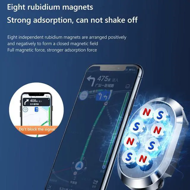 Magnetic Absorption Mobile Phone Bracket: 8 independent rubidium magnets, positive and negative arranged to form a closed magnetic field, full of magnetic force, stronger adsorption force, longer and wider magnetic absorption area, and can always maintain stability even on rough roads.