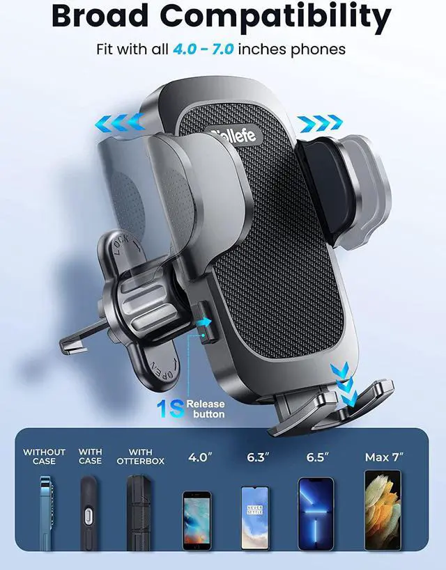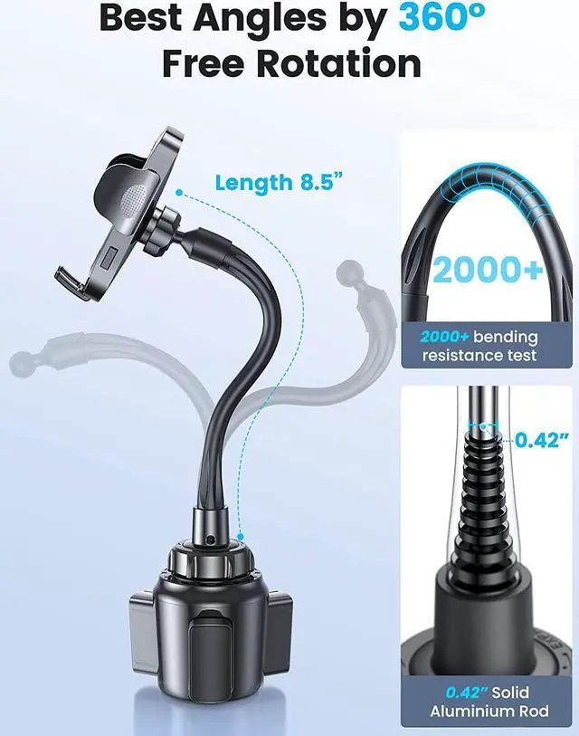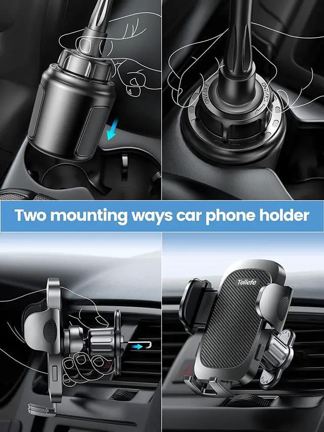 [Ultra Stable & Never Shaking] TOLLEFE Upgraded latest ultra sturdy and durable car cup phone holder the height-adjustable gooseneck with crack-resistant rubber wrapped high-density metal is up to 8.0. Ensure provides extremely anti-shake cup phone holder mount even drive on the bumpiest road. The soft silicone-wrapped clamp arms and holding shelf constituted triangle structure provide full protection for your phone. [Dual Mounting Ways] Vent Phone Holder or Cup Phone Holder either way mounting your phone as your choice. Never obstruct your driving view provide the safest glancing whiling driving experience. The metal-built clamp would never scratch car air vent and constituted solid triangular structure to secure your phone stay sturdy on TOLLEFE Vent Phone Holder.