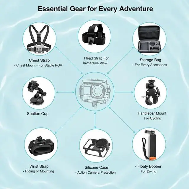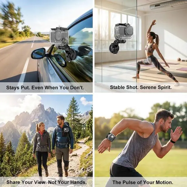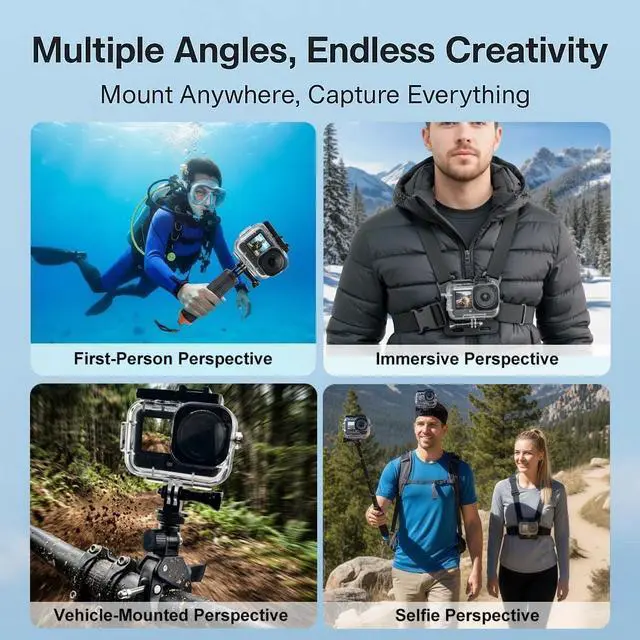 Enhanced Mounting System for Active Lifestyles --- Capture dynamic, hands-free perspectives with our robust mounting kit. Includes an upgraded, more secure Wrist strap for stable first-person views, a adjustable chest strap for immersive POV shots, a versatile head strap, a strong handlebar clamp for bikes, a backpack belt mount, and a reliable suction cup holder for smooth car or surface mounting.