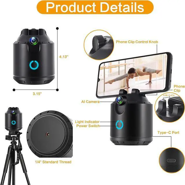 Interface - Supports Tripd]: The smart auto tracking phone holder comes with a standard 1/4" thread on the bottom, allowing you to mount it on a tripod and adjust the angle and height. With a clamping thickness of 0.28 - 0.47 inches and a load-bearing capacity of up to 1.1 pounds, this motion tracking tripod can clamp most phones.