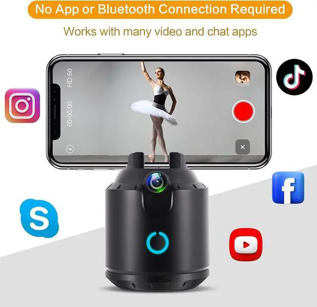 [No App or Bluetooth Required] - This auto tracking tripod can be used by long pressing for 2 seconds, tracking your face without the app or Bluetooth connection to protect privacy. Moreover, this 360 rotating camera stand works with many video and chat apps such as YouTube, Facebook, Tik Tok, etc.