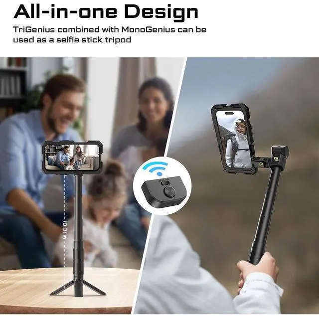 The Freewell Genius Rig Cage features versatile handles that cater to different shooting needs. The TriGenius handle functions as a tripod with 360-degree rotation, providing flexible angles for capturing the perfect shot. Meanwhile, the MonoGenius handle serves as both a monopod and an extension rod, extending up to 26.2cm, making it perfect for diverse shooting conditions and offering full 360-degree rotation for dynamic filming.