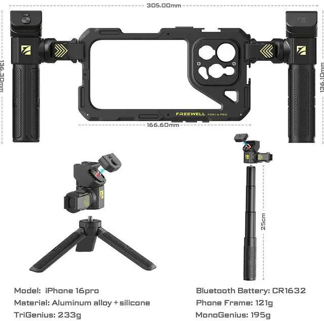 Constructed from high-grade aluminum alloy, this lightweight yet durable rig weighs just 116g (without handles), making it easy to transport and ideal for vloggers, YouTubers, and TikTokers seeking a reliable mobile rig. Whether you're filming in complex environments or need a stable setup for professional shots, the Freewell Genius Rig Cage for iPhone 16 Pro is your go-to solution for superior mobile videography.